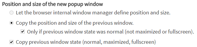 If you would like that the popup window has the same window state as the previous parent window, enable "Copy previous window state (normal, maximized, fullscreen)".